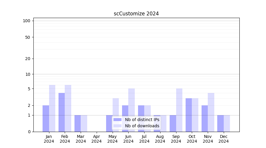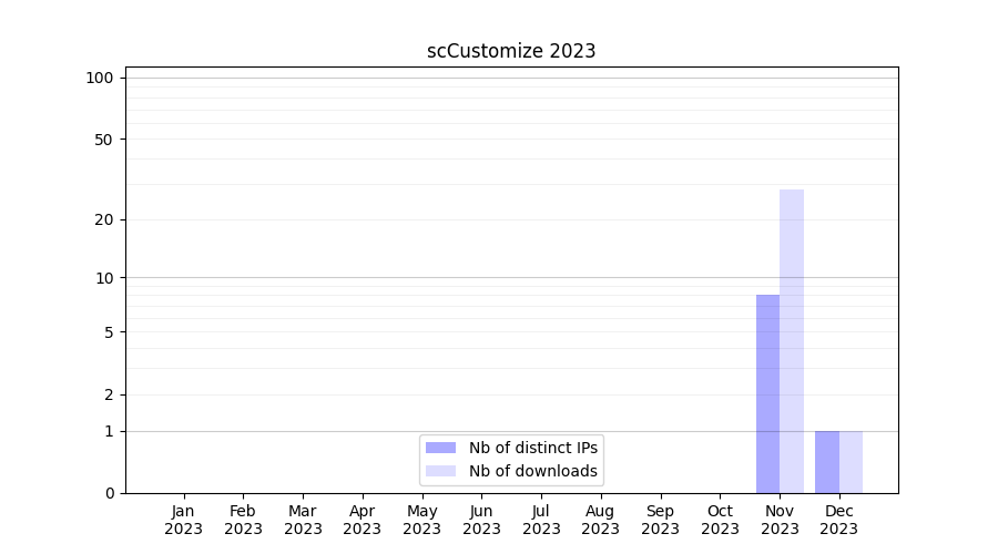 Number of downloads for experiment package scCustomize, year by year, from 2025 back to 2014 (years with no downloads are omitted):