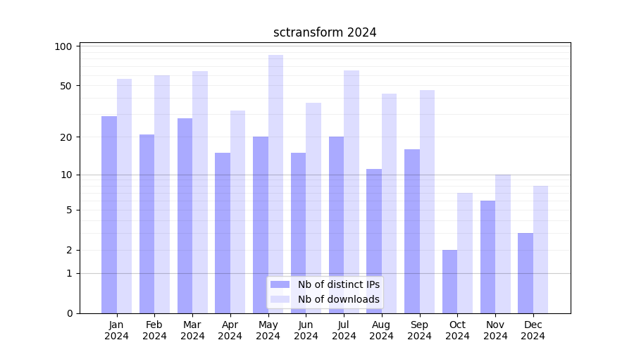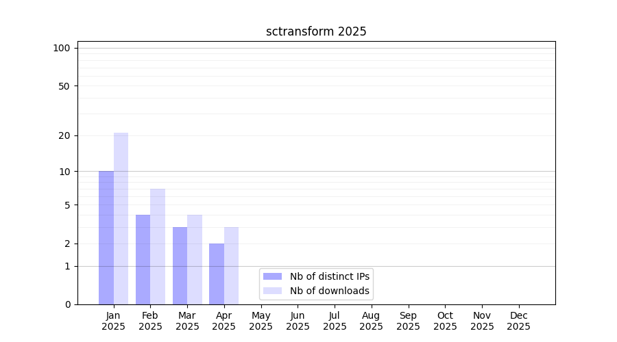 Number of downloads for experiment package sctransform, year by year, from 2025 back to 2014 (years with no downloads are omitted):