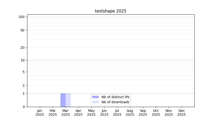 Number of downloads for experiment package textshape, year by year, from 2025 back to 2014 (years with no downloads are omitted):