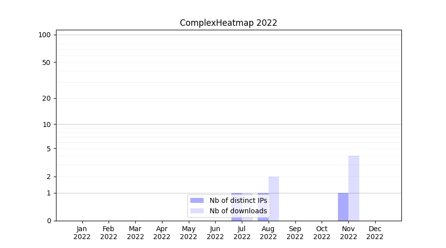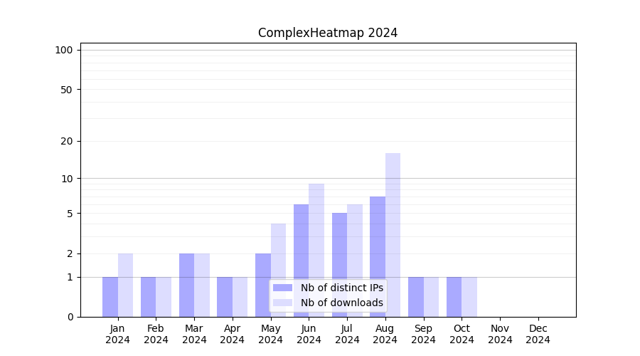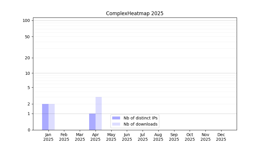 Number of downloads for workflow package ComplexHeatmap, year by year, from 2025 back to 2015 (years with no downloads are omitted):