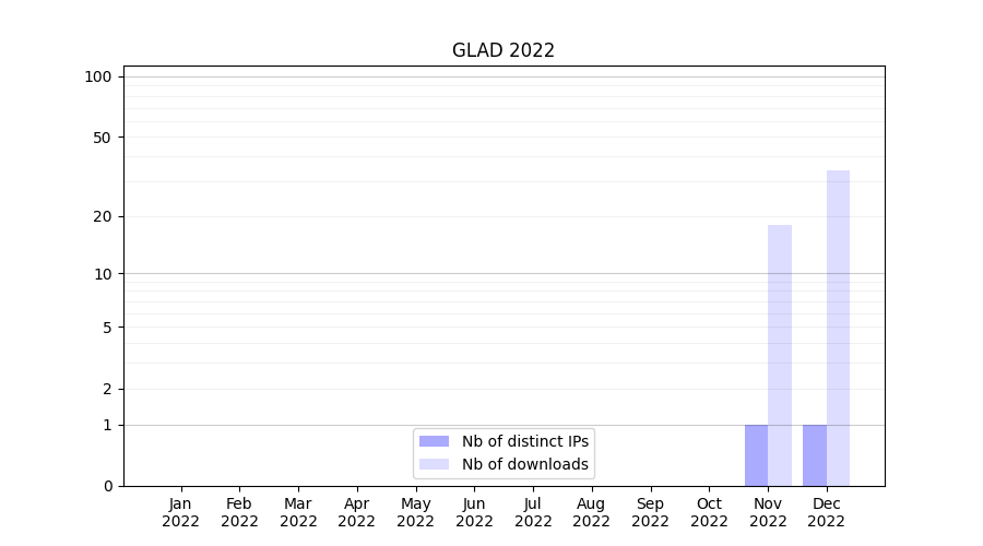 Number of downloads for workflow package GLAD, year by year, from 2025 back to 2015 (years with no downloads are omitted):