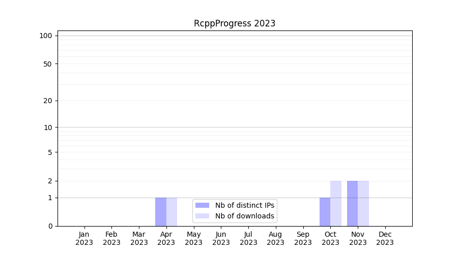 Number of downloads for workflow package RcppProgress, year by year, from 2025 back to 2015 (years with no downloads are omitted):