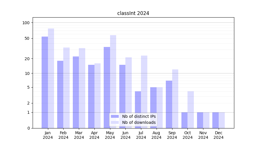 Number of downloads for workflow package classInt, year by year, from 2025 back to 2015 (years with no downloads are omitted):
