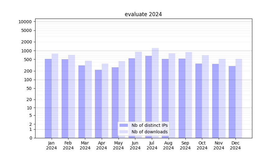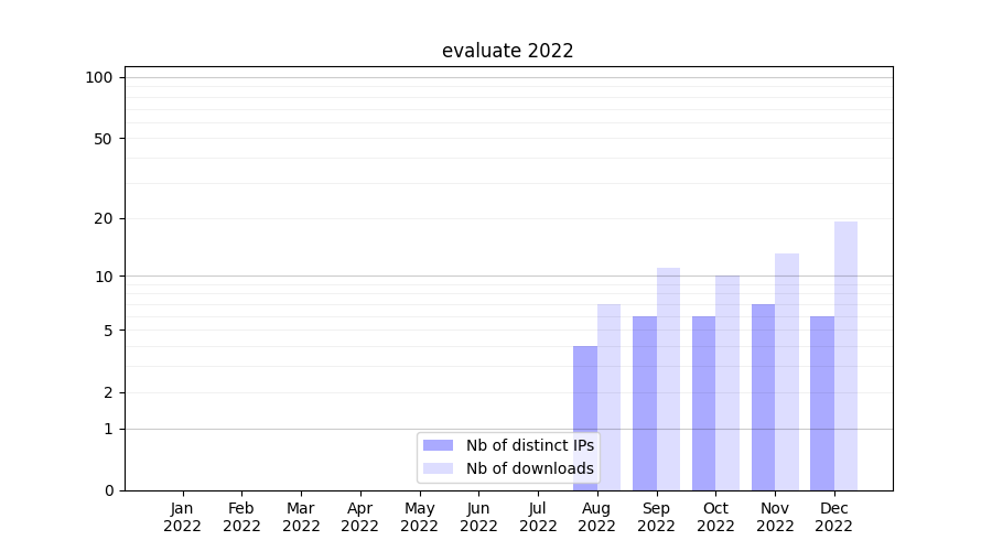 Number of downloads for workflow package evaluate, year by year, from 2025 back to 2015 (years with no downloads are omitted):