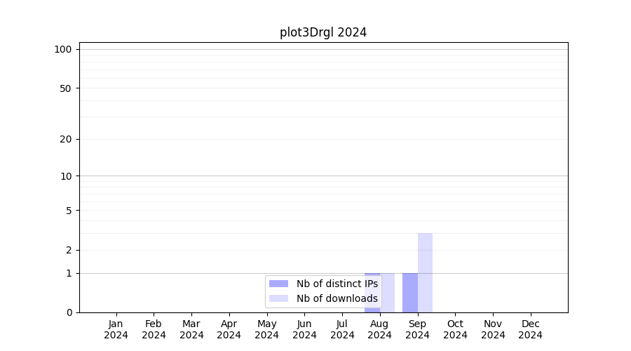 Number of downloads for workflow package plot3Drgl, year by year, from 2025 back to 2015 (years with no downloads are omitted):