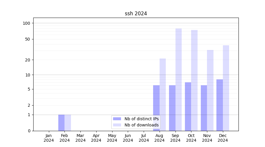 Number of downloads for workflow package ssh, year by year, from 2025 back to 2015 (years with no downloads are omitted):