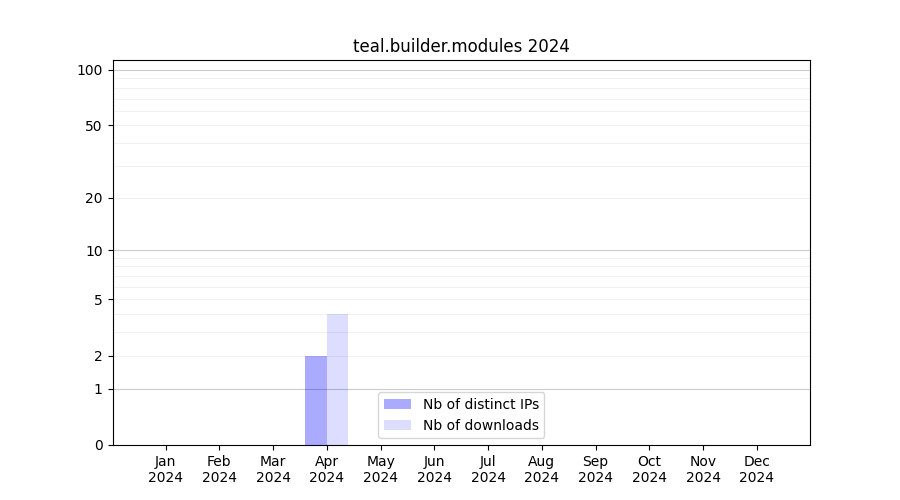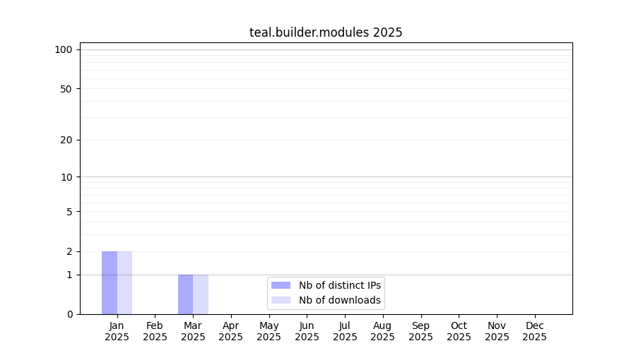 Number of downloads for workflow package teal.builder.modules, year by year, from 2025 back to 2015 (years with no downloads are omitted):
