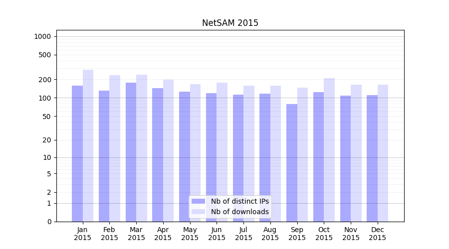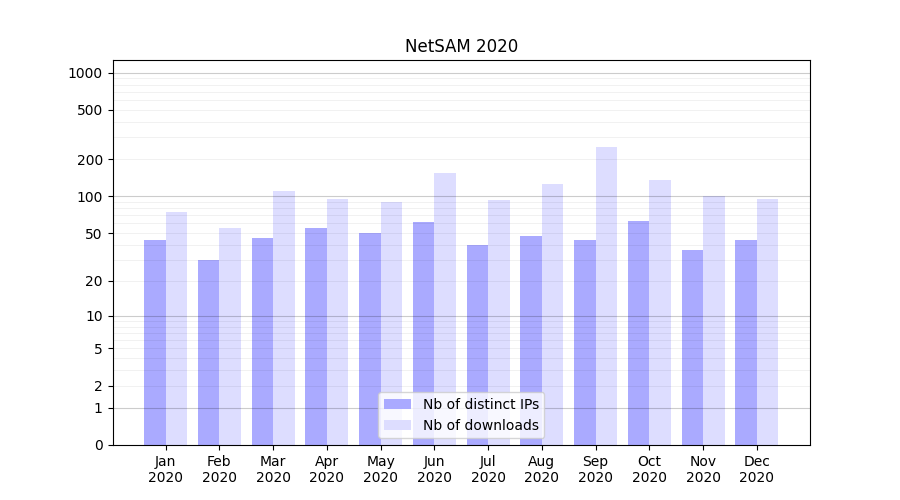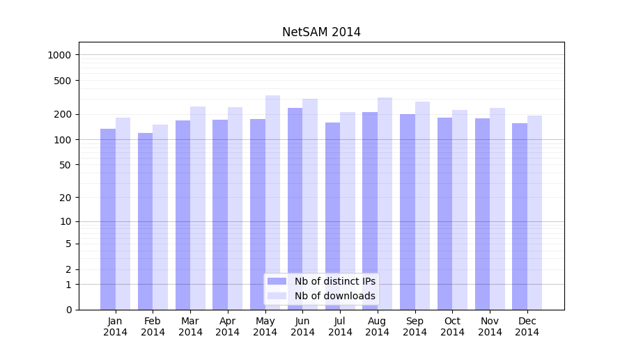 Number of downloads for software package NetSAM, year by year, from 2025 back to 2014 (years with no downloads are omitted):