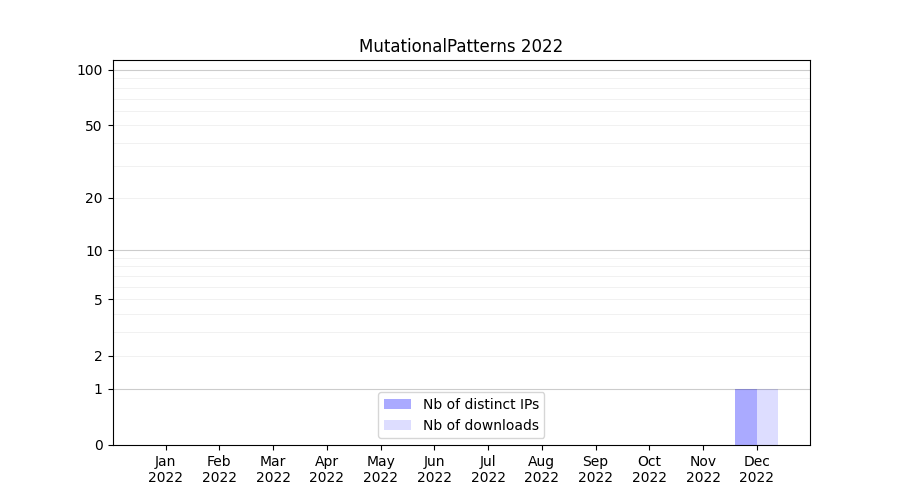 Number of downloads for annotation package MutationalPatterns, year by year, from 2025 back to 2014 (years with no downloads are omitted):