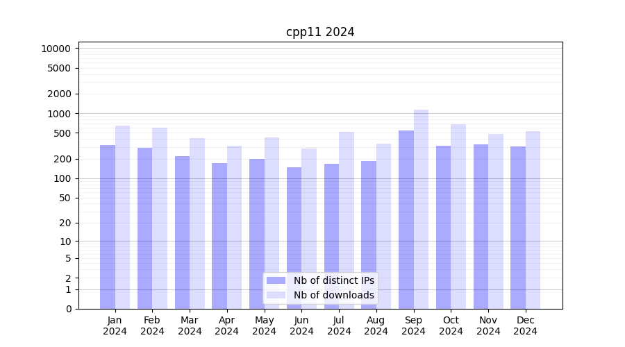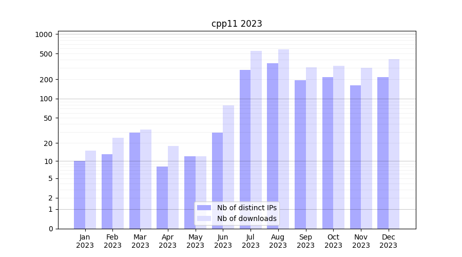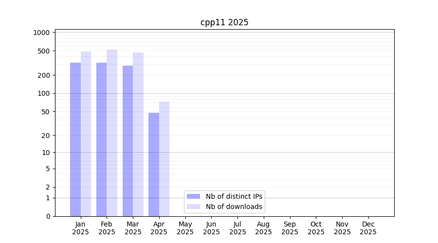 Number of downloads for annotation package cpp11, year by year, from 2025 back to 2014 (years with no downloads are omitted):