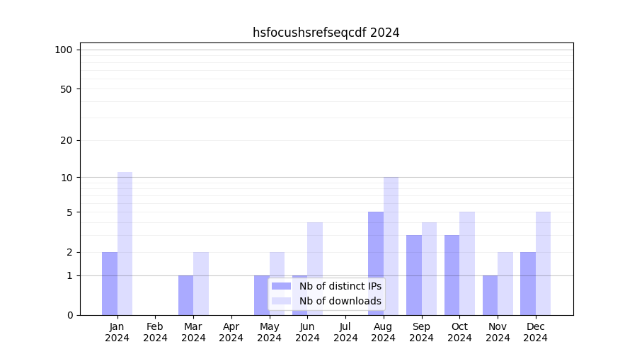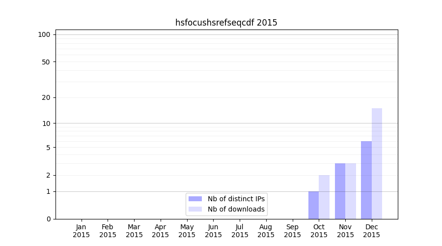 Number of downloads for annotation package hsfocushsrefseqcdf, year by year, from 2025 back to 2014 (years with no downloads are omitted):