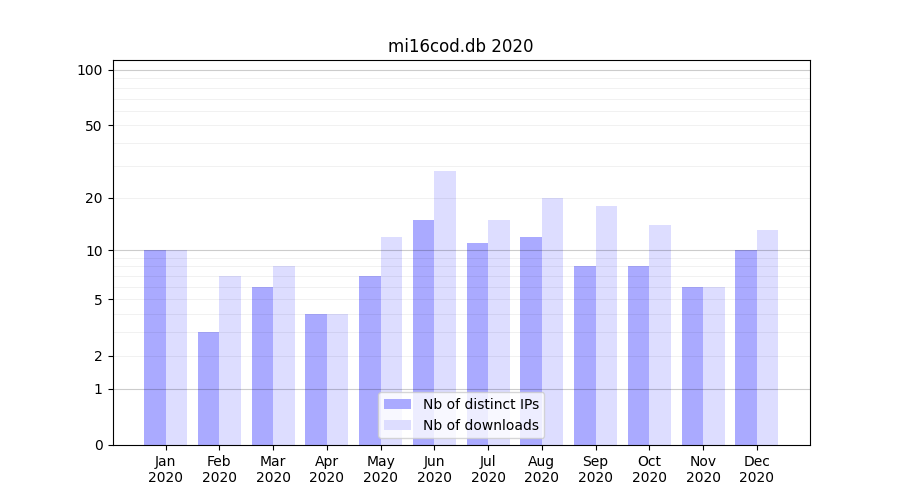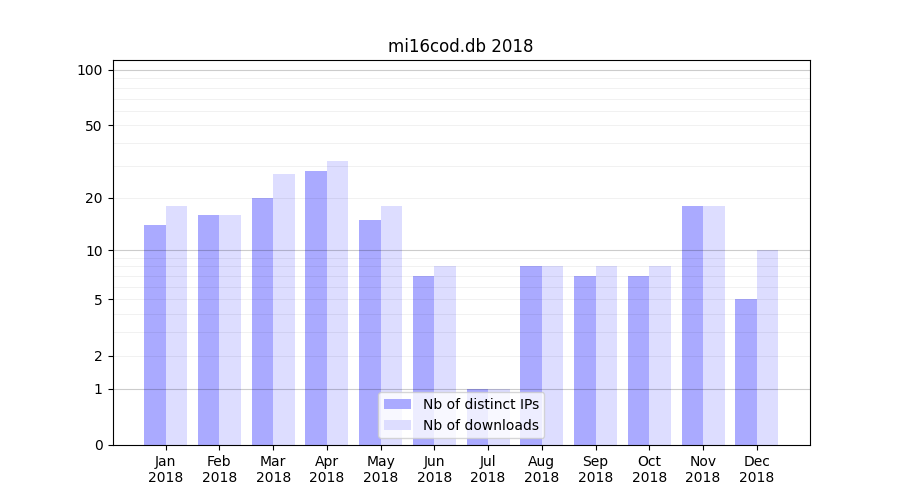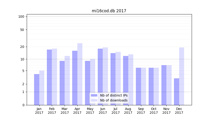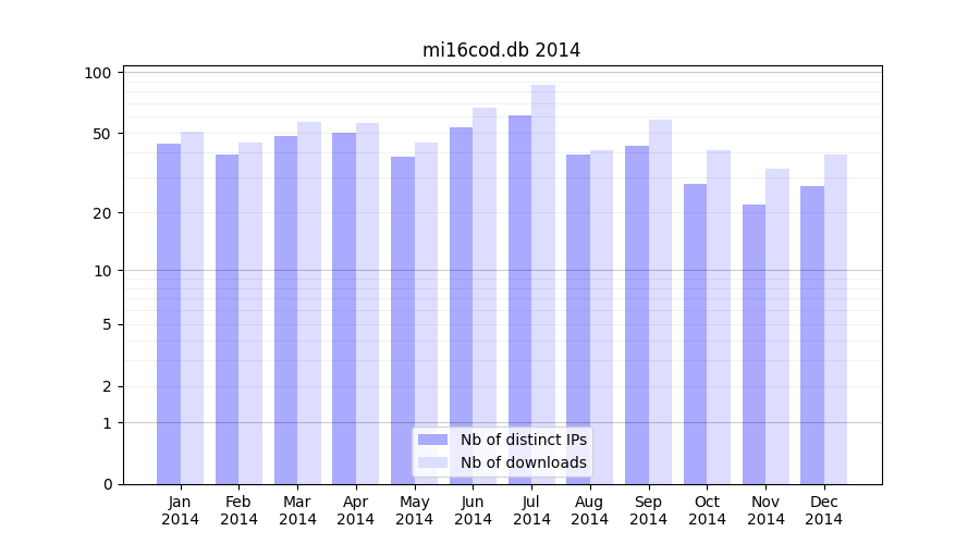 Number of downloads for annotation package mi16cod.db, year by year, from 2025 back to 2014 (years with no downloads are omitted):