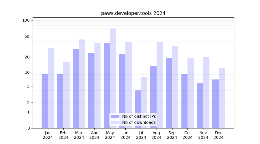 Number of downloads for annotation package paws.developer.tools, year by year, from 2025 back to 2014 (years with no downloads are omitted):