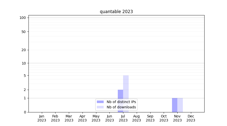 Number of downloads for annotation package quantable, year by year, from 2025 back to 2014 (years with no downloads are omitted):