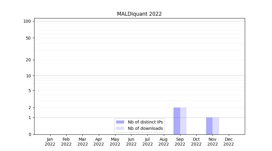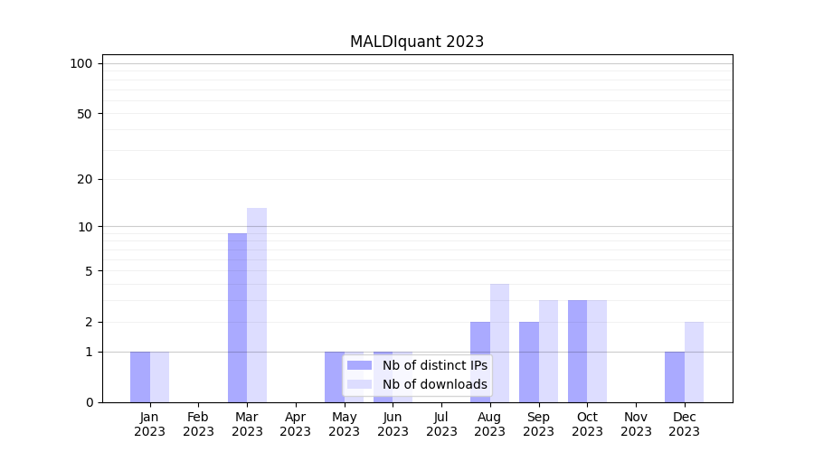 Number of downloads for experiment package MALDIquant, year by year, from 2025 back to 2014 (years with no downloads are omitted):