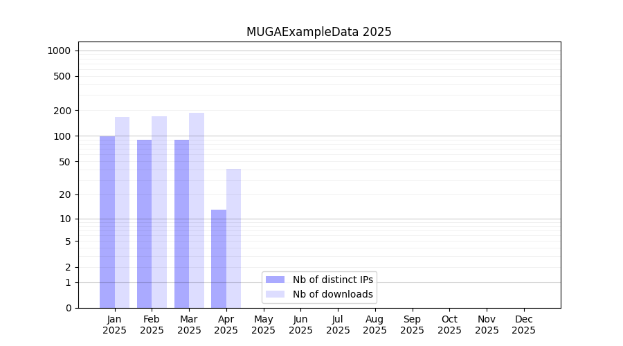 Number of downloads for experiment package MUGAExampleData, year by year, from 2025 back to 2014 (years with no downloads are omitted):