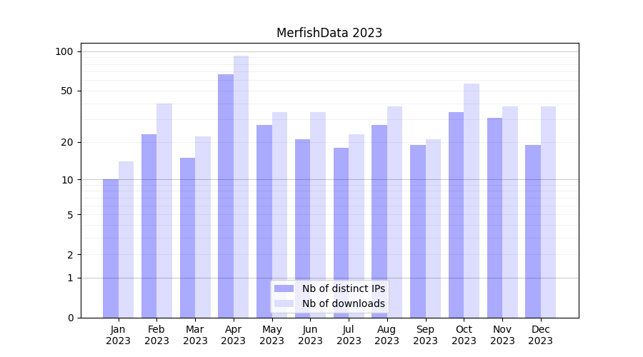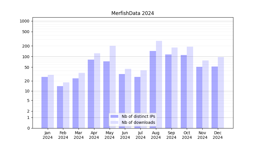 Number of downloads for experiment package MerfishData, year by year, from 2025 back to 2014 (years with no downloads are omitted):