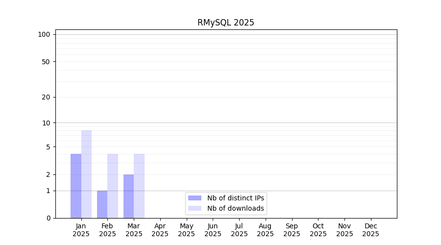 Number of downloads for experiment package RMySQL, year by year, from 2025 back to 2014 (years with no downloads are omitted):