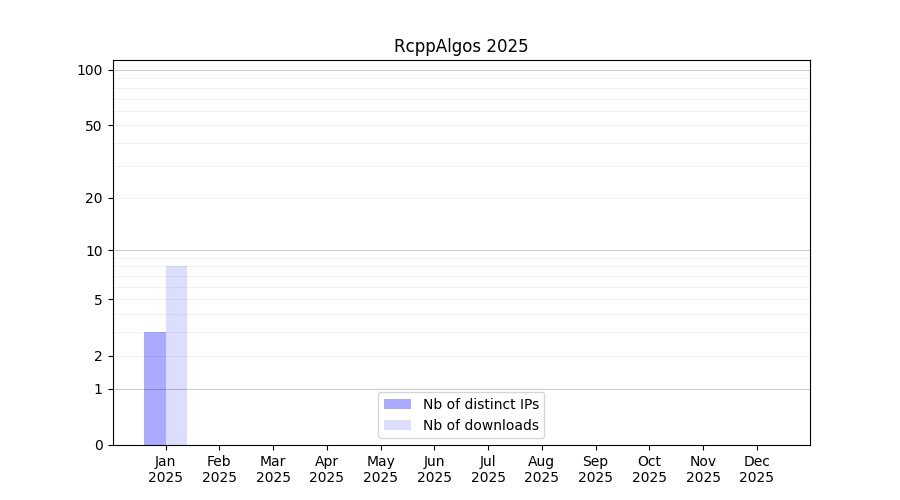Number of downloads for experiment package RcppAlgos, year by year, from 2025 back to 2014 (years with no downloads are omitted):