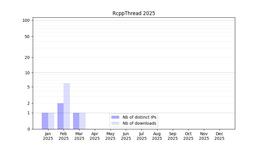 Number of downloads for experiment package RcppThread, year by year, from 2025 back to 2014 (years with no downloads are omitted):
