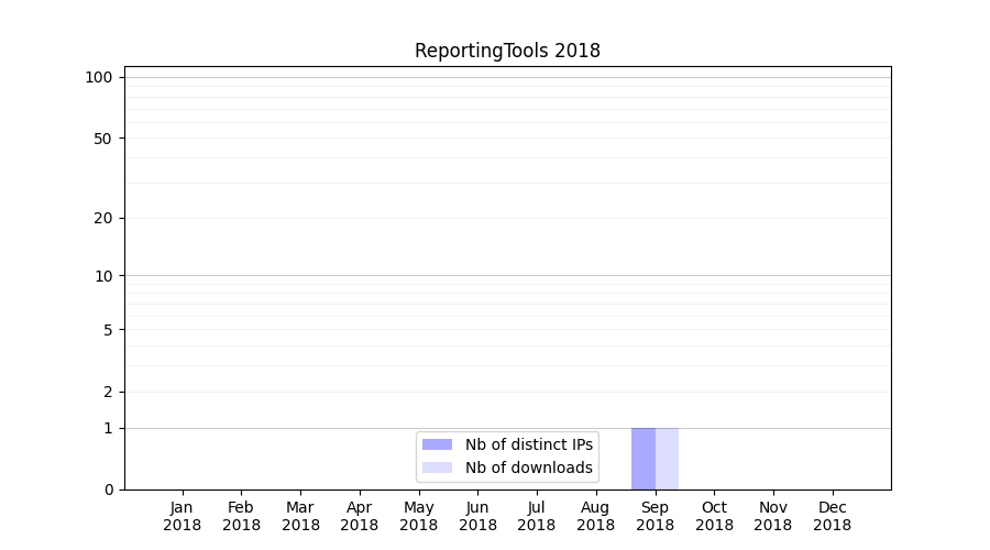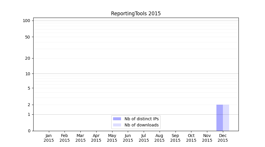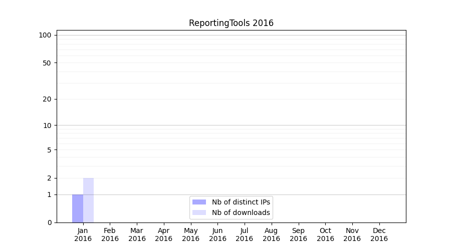 Number of downloads for experiment package ReportingTools, year by year, from 2025 back to 2014 (years with no downloads are omitted):