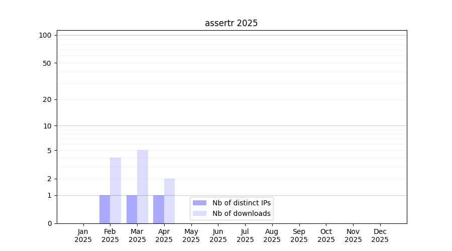 Number of downloads for experiment package assertr, year by year, from 2025 back to 2014 (years with no downloads are omitted):