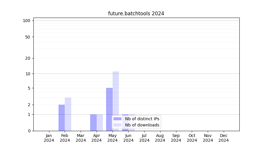 Number of downloads for experiment package future.batchtools, year by year, from 2025 back to 2014 (years with no downloads are omitted):