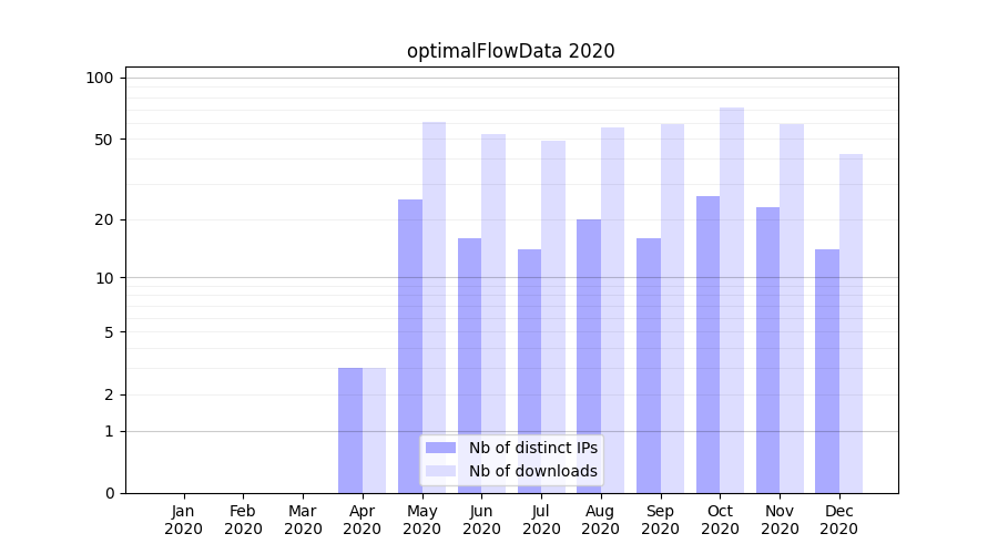 Number of downloads for experiment package optimalFlowData, year by year, from 2025 back to 2014 (years with no downloads are omitted):
