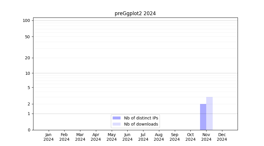 Number of downloads for experiment package preGgplot2, year by year, from 2025 back to 2014 (years with no downloads are omitted):
