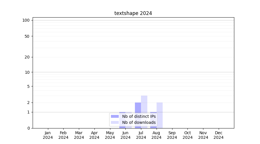 Number of downloads for experiment package textshape, year by year, from 2025 back to 2014 (years with no downloads are omitted):