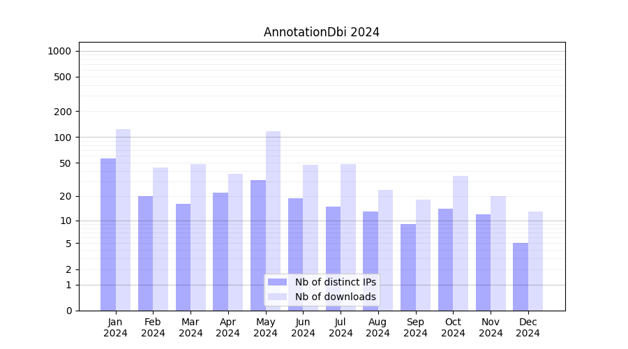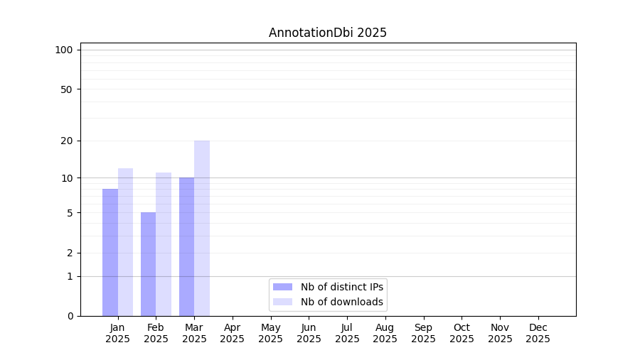 Number of downloads for workflow package AnnotationDbi, year by year, from 2025 back to 2015 (years with no downloads are omitted):