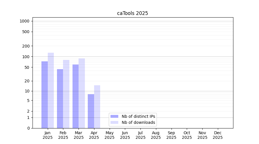Number of downloads for workflow package caTools, year by year, from 2025 back to 2015 (years with no downloads are omitted):